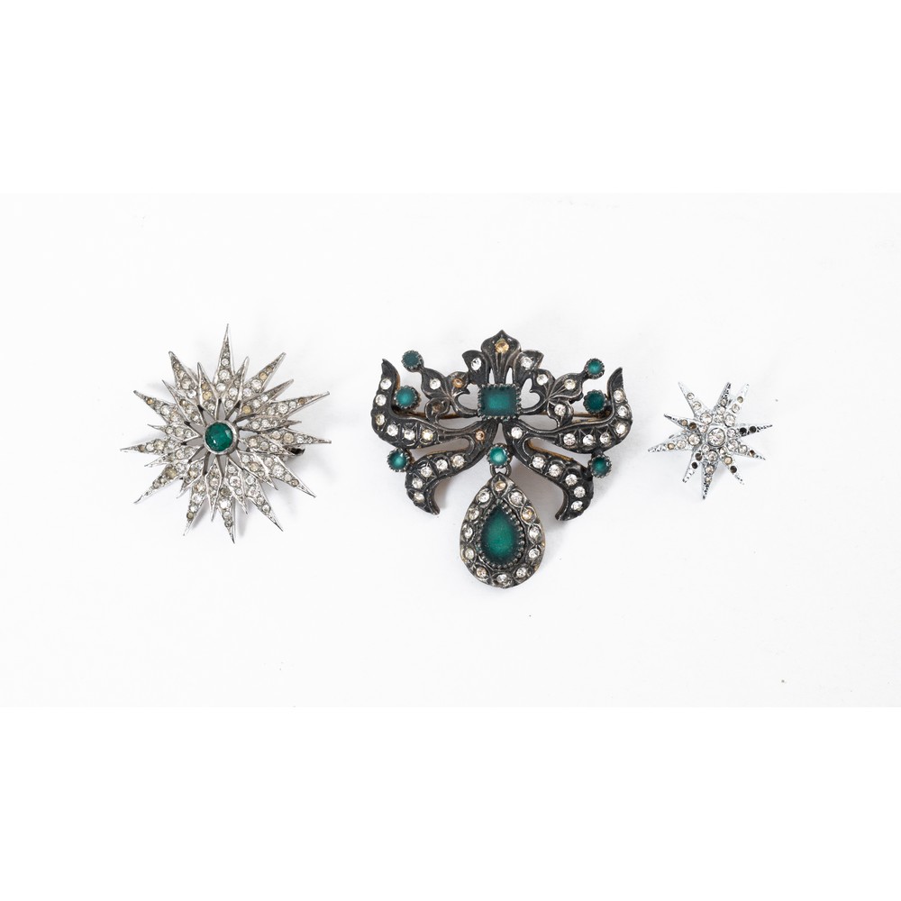 Tre spille con montatura in metallo argentato, una a batti petto con diamanti e smeraldi sintetici, goccia basculante; una a stella con diamanti e smeraldo sintetici; una spilla a stella con diamanti sintetici, mancanze.