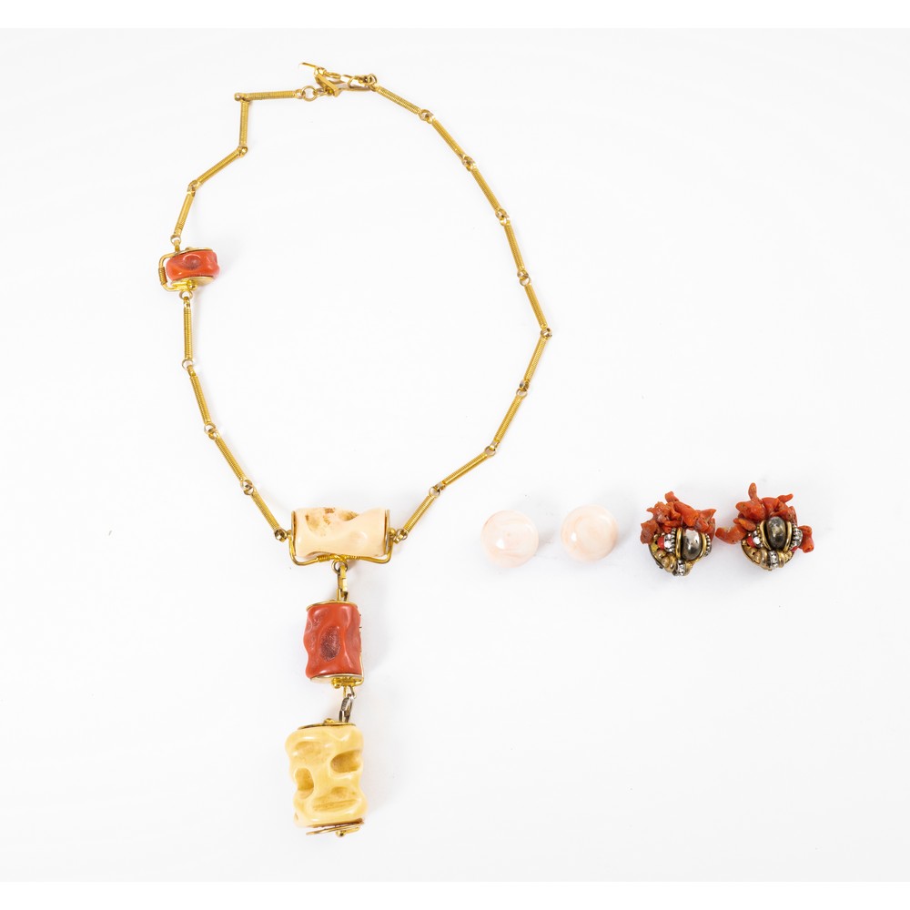Collana con montatura in metallo dorato composta da elementi rigidi a bacchetta con snodi, coralli sintetici di grosso spessore. Orecchini con montatura in metallo, cabochon semisferici in corallo sintetico rosa, chiusura a clips. Orecchini con montatura in metallo dorato, rami di corallo, diamanti sintetici, metallo brunito, chiusura a clips.