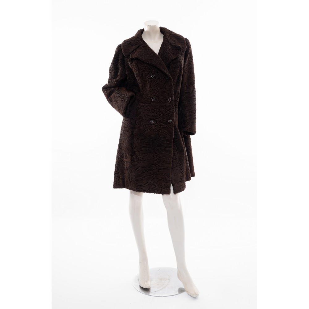 Cappotto in pelliccia di Breitschwanz marrone con pelli lavorate per intero, collo a doppio petto, bottoni gioiello, maniche lunghe, due tasche. Usura al collo. Taglia sartoriale M. Fodera interna con usure.