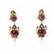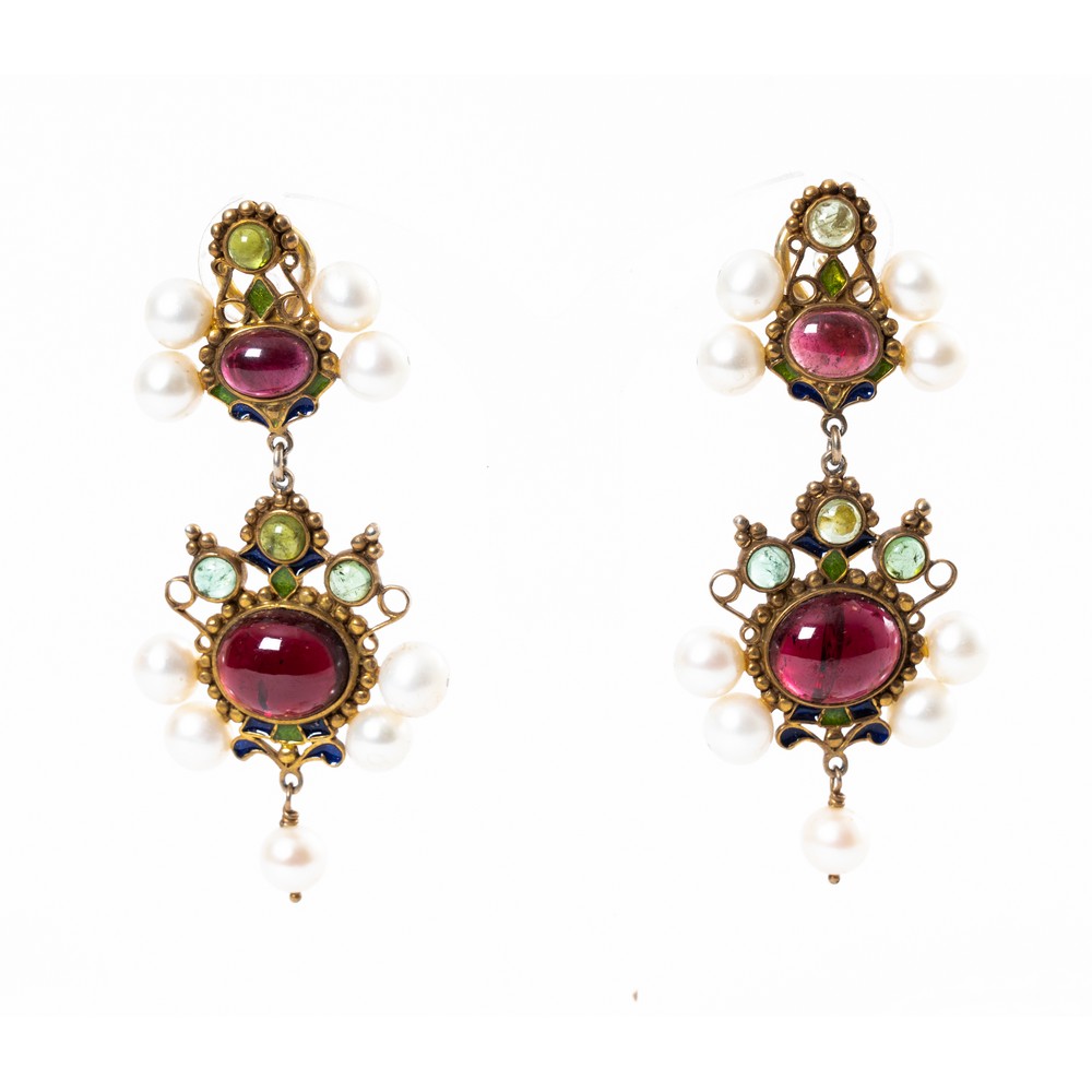 Orecchini con montatura in metallo dorato, pietre cabochon lilla e verdi, smalti blu e verdi, perle, chiusura con chiodo e clips.