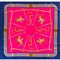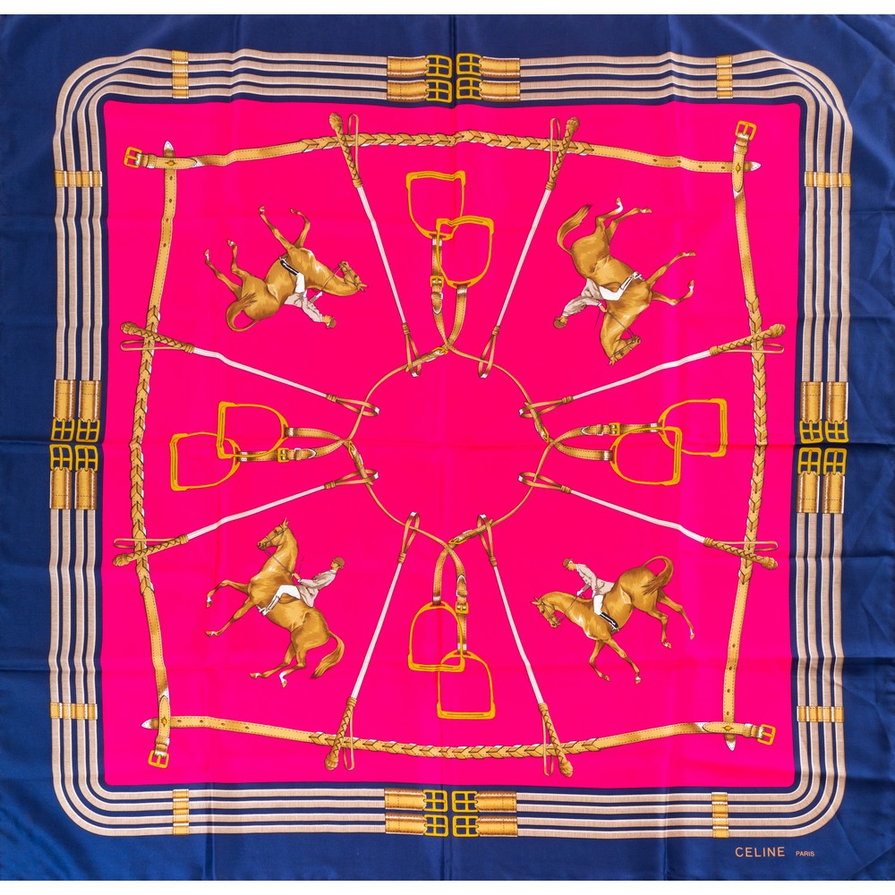 Foulard in seta a fondo fuxia con scene e temi equestri, bordo blu. Marchio di produzione.