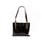 Borsa a spalla modello shopper in pelle nera, manici piatti regolabili con fibbie in metallo dorato, logo dorato in basso, chiusura a pressione sul bordo superiore, due tasche interne. Marchio di produzione.