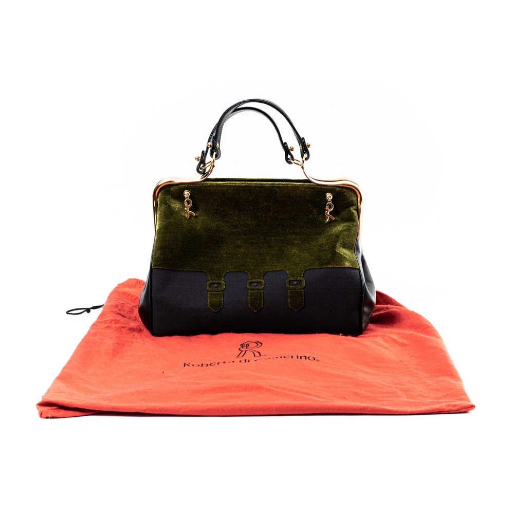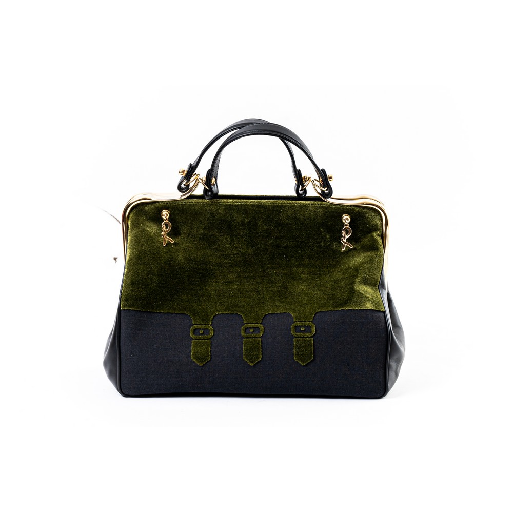 Borsa a mano modello “Doctor Bag” in velluto verde e tessuto nero, chiusura e profilo superiore sagomato in metallo dorato, due “R” sul fronte superiore, manico piatto, due tasche. Dust Bag. Marchio di produzione.