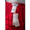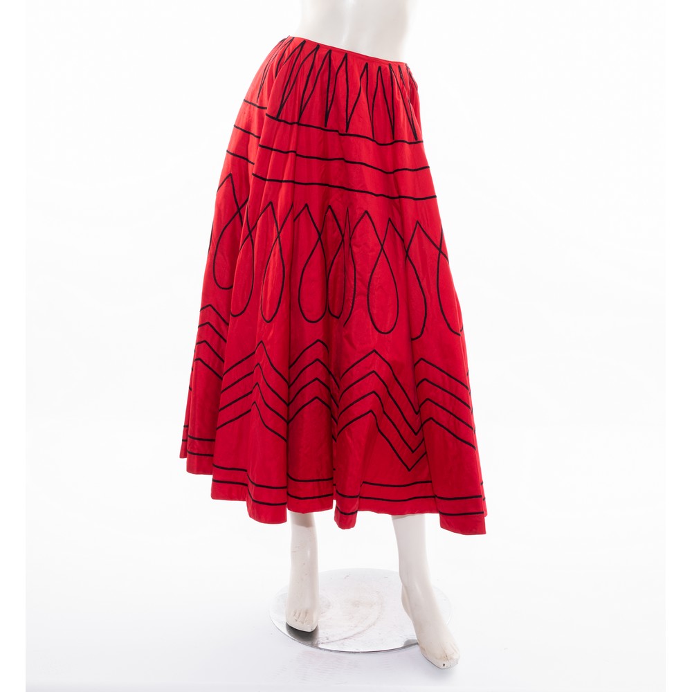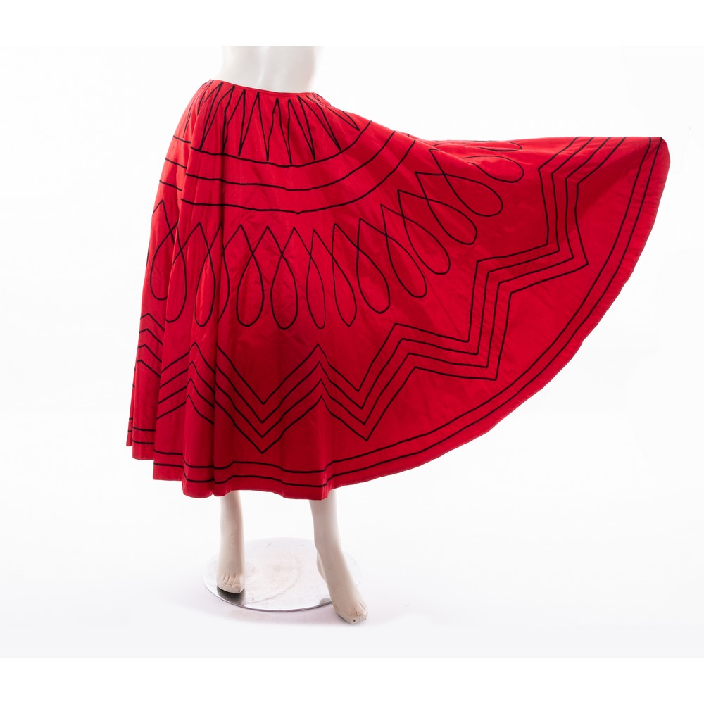 Gonna a ruota in tessuto di cotone rosso ricamata in nero con disegni geometrici. Mai indossata. Taglia 42. Etichetta e marchio di produzione.