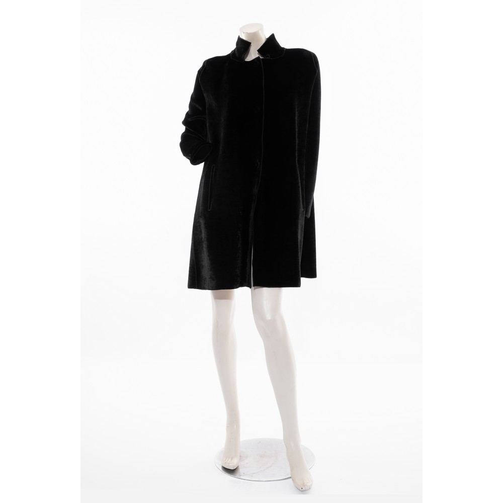 Giacca in tessuto di velluto nero, abbottonatura frontale a pressione, manica lunga collo lievemente montante. Taglia 38. Etichetta di produzione.