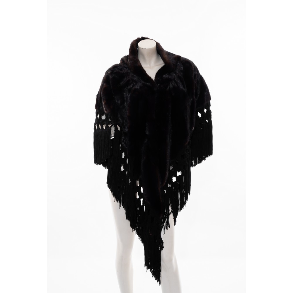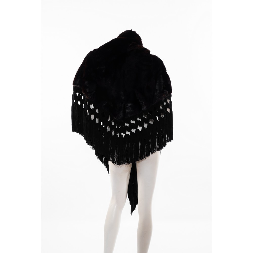 Scialle in pelliccia di visone Blackglama, lavorazione a pelli intere con frange in camoscio nero. Taglia unica. Etichetta di produzione.