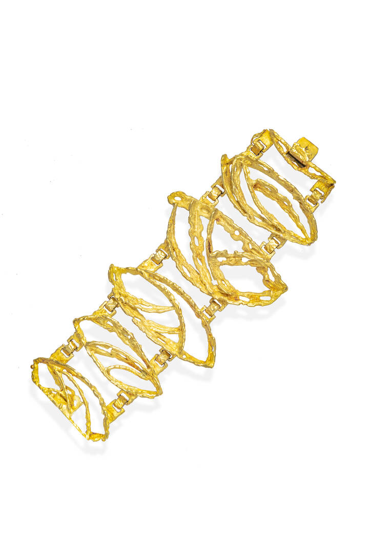 Imponente bracciale-scultura in oro giallo, firmato "Forza", interamente lavorato a motivi geometrici ovali con lavorazione etrusca.