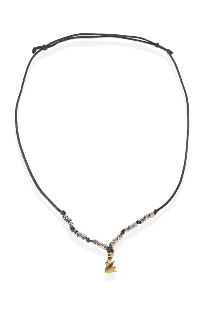 Girocollo composto da filo di tessuto con pepite in argento e ciondolo a forma di pesce, firmato "Pomellato", modello "Dodo" in oro giallo (Peso gr 1)