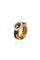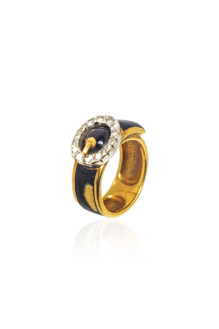 Anello in oro giallo e bianco, firmato "Fred-Paris", a fibbia con smalto nero (mancanze) e diamanti taglio 8/8 per totali ct 0,30 ca