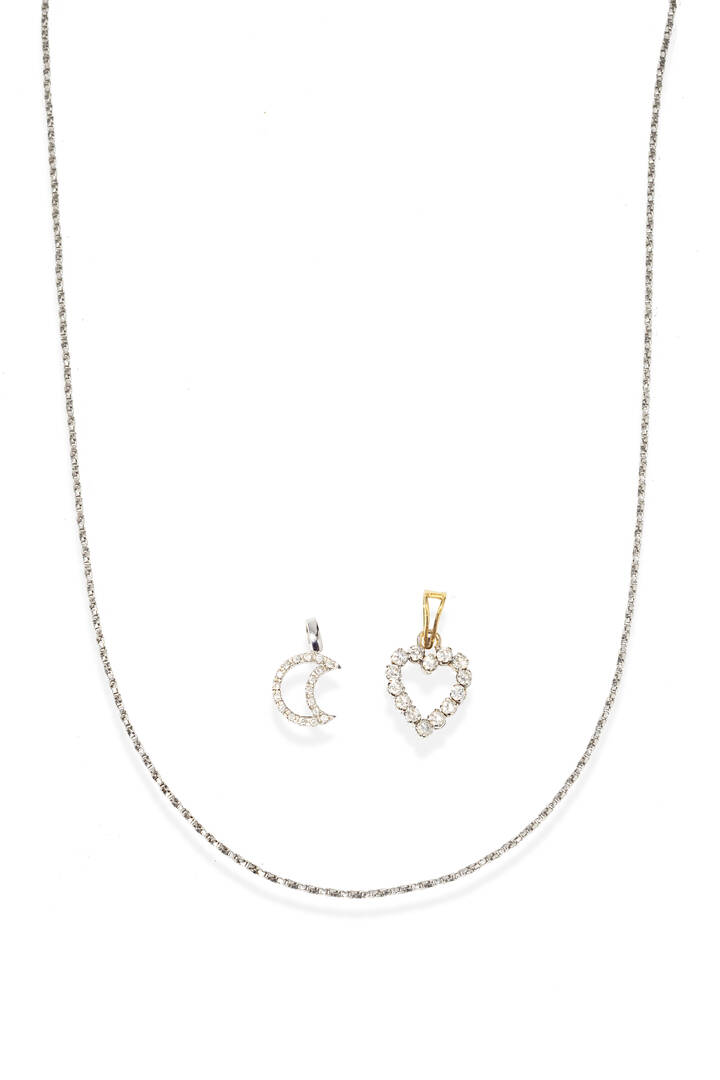 in oro bianco con due ciondoli; uno a forma di luna e uno a forma di cuore con diamanti taglio brillante per totali ct 0,50 ca