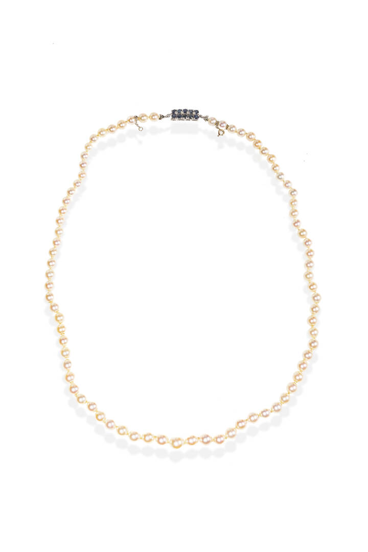 composta da un filo di perle giapponesi a scalare dal diam. di mm 6,3 a 8,5 ca. Chiusura in oro bianco con zaffiri taglio rotondo per totali ct 2,0 ca, e diamanti taglio 8/8 per totali ct 0,04