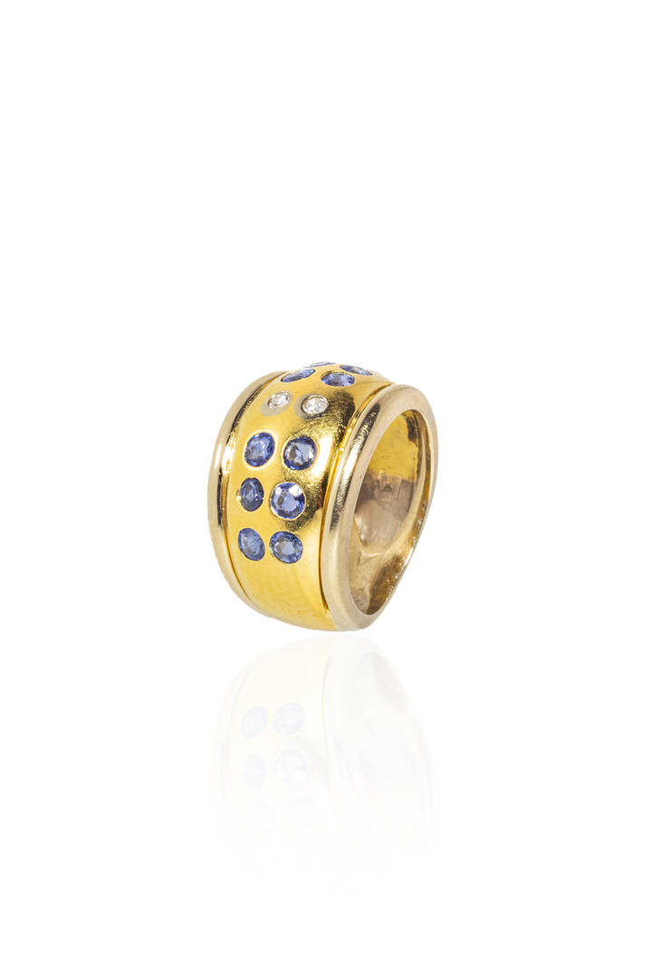 in oro giallo, a fascia, con zaffiri e due diamanti taglio brillante per totali ct 0,02 ca