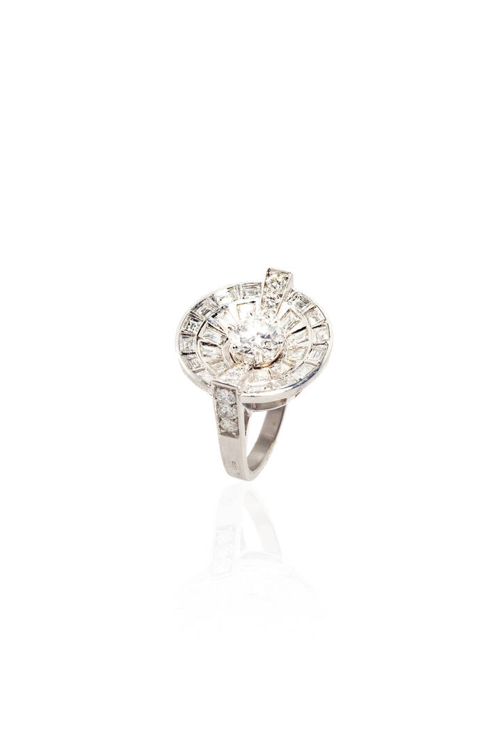Chevalier, in oro bianco, firmato "Cirio-Torino", sommità rotonda con al centro diamante taglio brillante di ct 0,75 ca e contornato da diamanti taglio baguette e brillante per totali ct 3,0 ca, probabile colore G.H, purezza VVS-VS