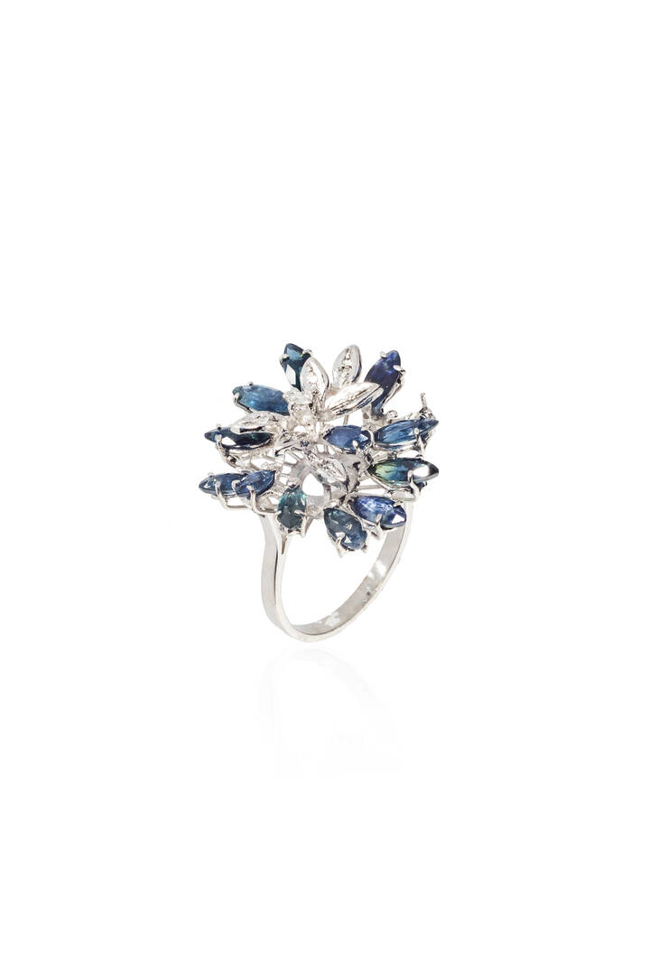 in oro bianco, anni '60, sommità a cespuglio con zaffiri taglio navette (uno mancante) per totali ct 2,0 ca e diamanti taglio 8/8 per totali ct 0,06 ca
