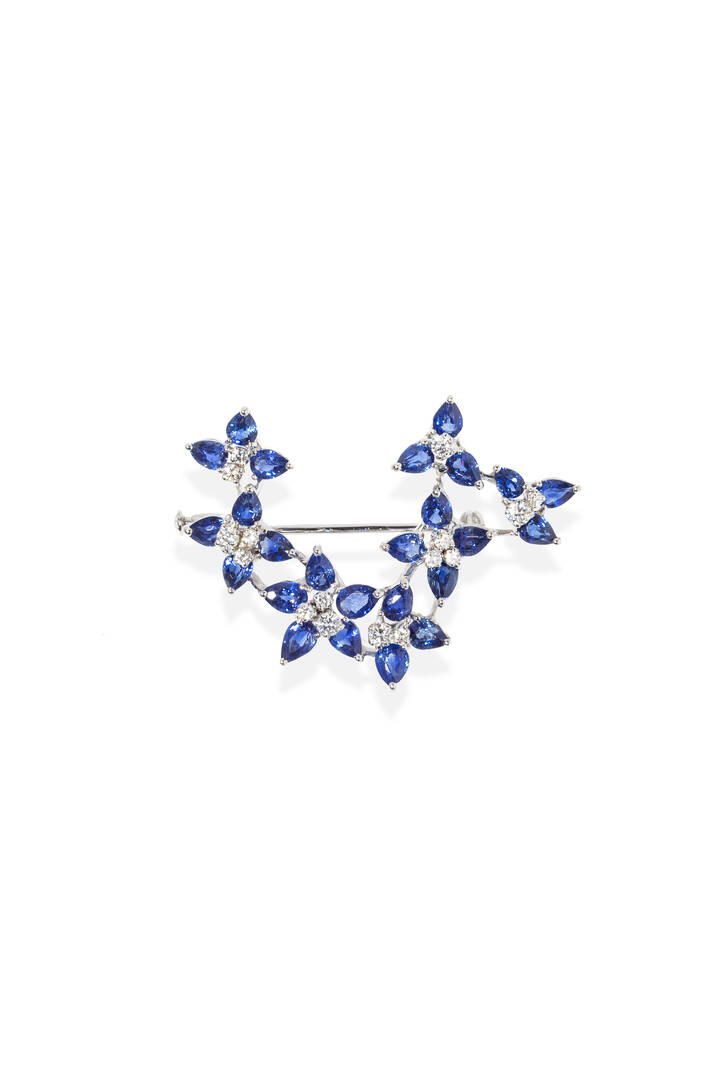 in oro bianco, anni '50, a forma di voluta, con zaffiri taglio a goccia per totali ct 6,0 ca e diamanti taglio brillante per totali ct 0,50 ca, probabile colore G-H, purezza VVS-VS.