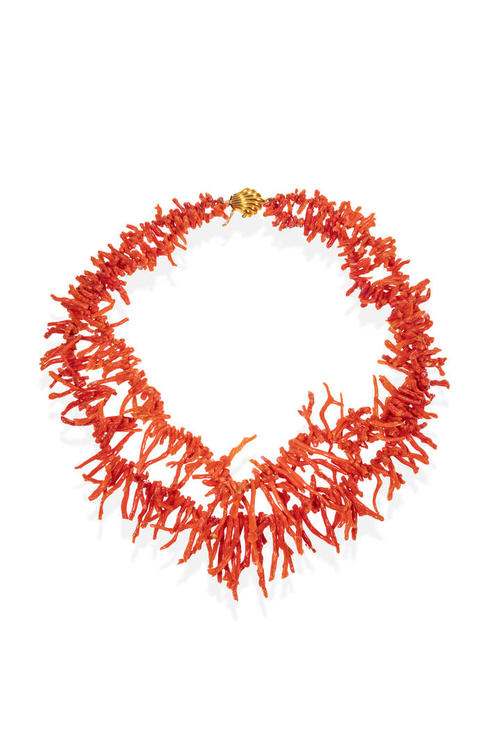composto da due fili di rami di corallo rosso mediterraneo. Chiusura in oro giallo.