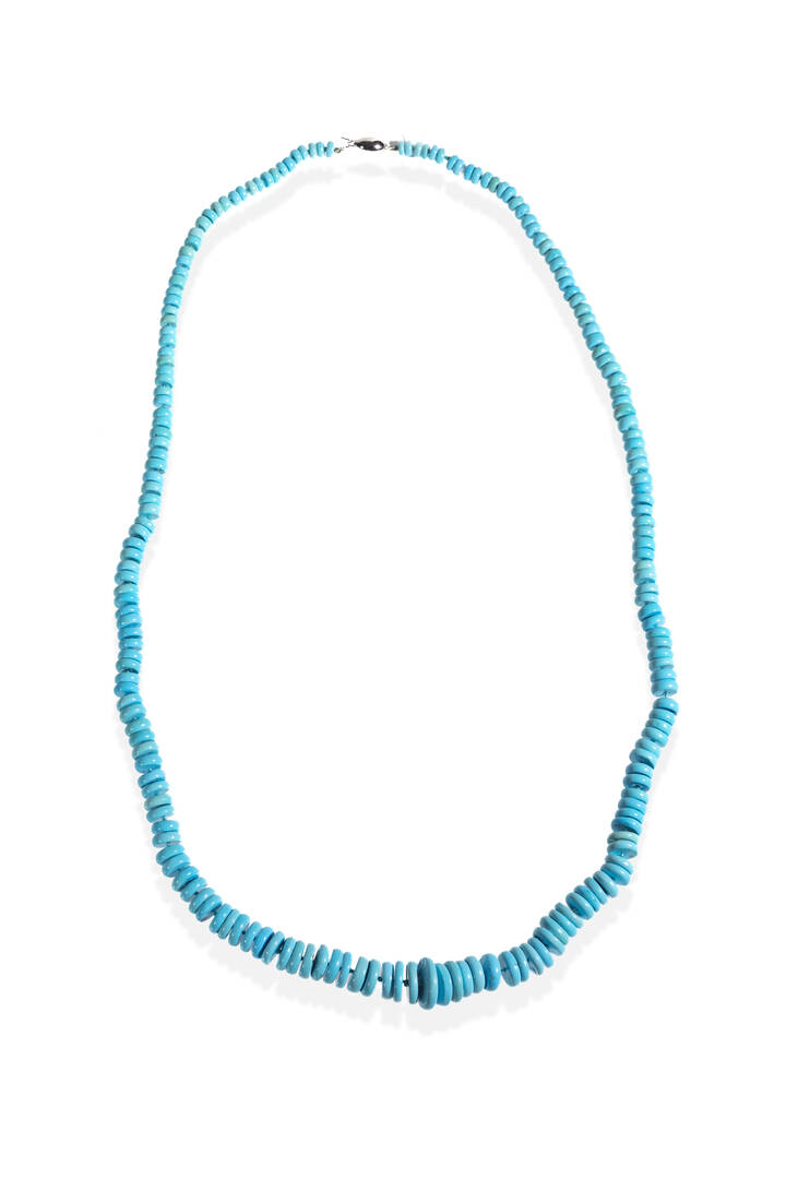 composta da dischi a scalare di turchese stabilizzato. Chiusura in oro bianco a barilotto