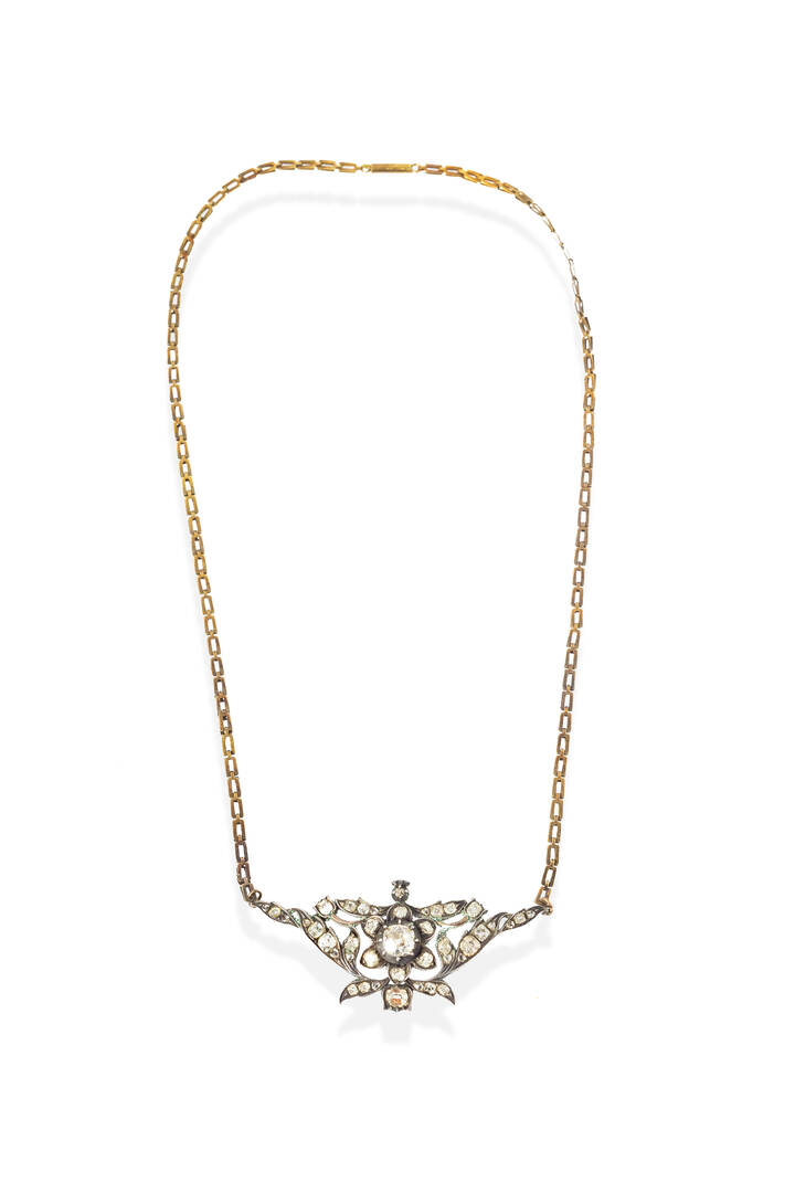 XIX secolo, composto da catena in oro giallo 9K e centrale a voluta in argento con diamanti taglio vecchio per totali ct 1,50 ca