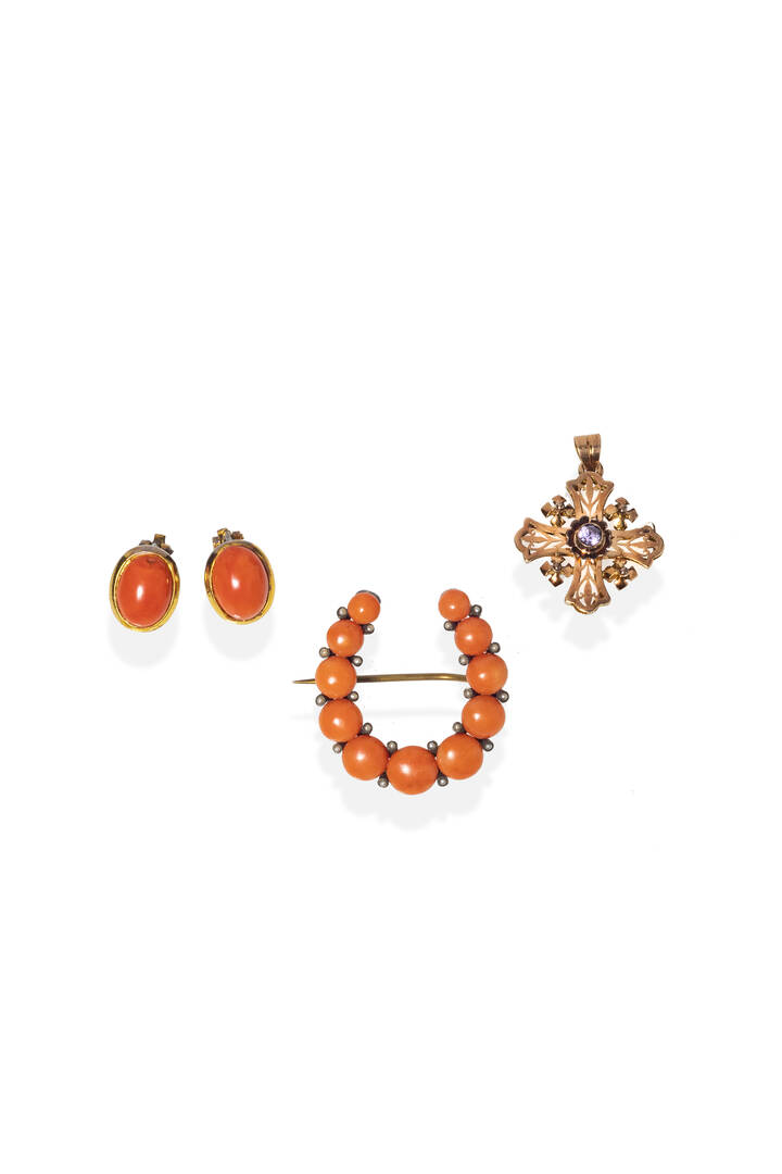 - spilla in metallo dorato, XIX secolo, a forma di ferro di cavallo con sfere di corallo color salmone e piccole perline.