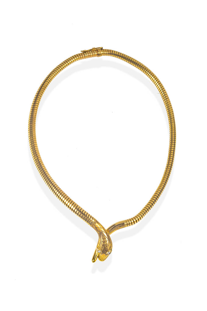 in oro rosa 9 Kt punzoni inglesi, città di Birmingham, a forma di serpente in maglia tubogas. Due diamanti come occhi per totali ct 0,04 ca