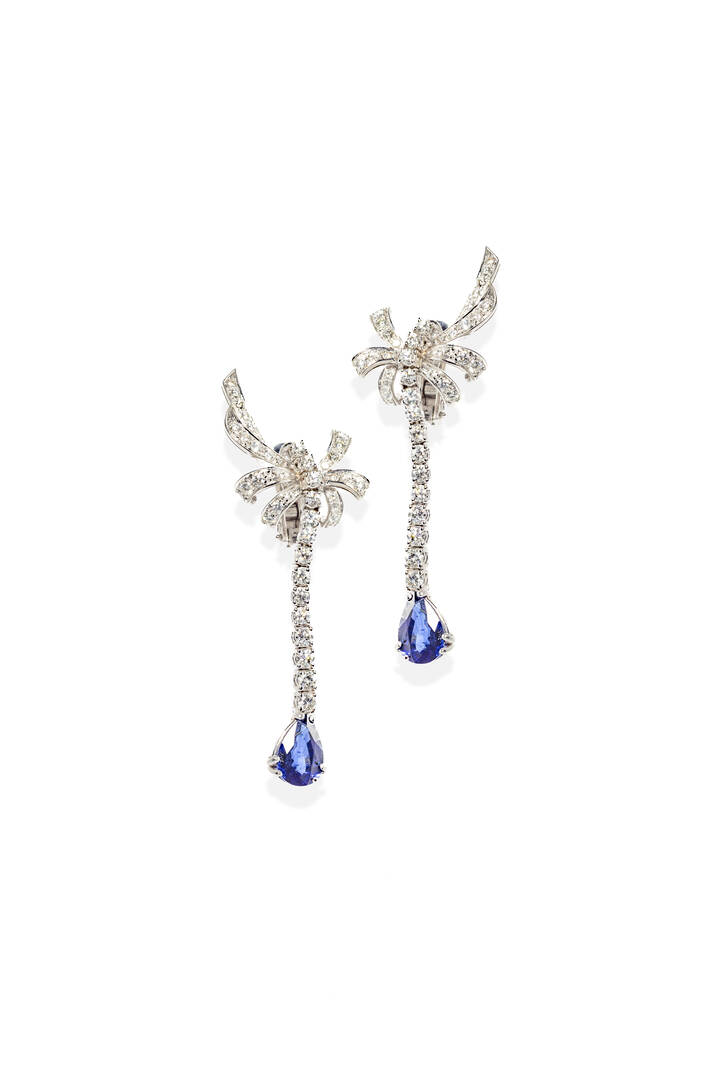in oro bianco, ai lobi fiocchi; corpo con diamanti taglio brillante per totali ct 2,30 ca, probabile colore G-H, purezza IF-VVS, terminanti con due zaffiri taglio a goccia per totali ct 3,60 ca
