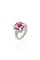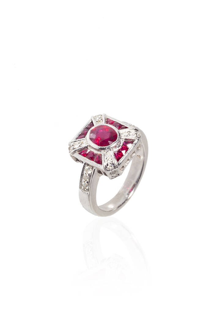 in oro bianco, sommità rettangolare con al centro un rubino taglio ovale di ct 1 ca; rubini sfaccettati a decoro e diamanti taglio brillante e 8/8 e per totali ct 0,30 ca,
