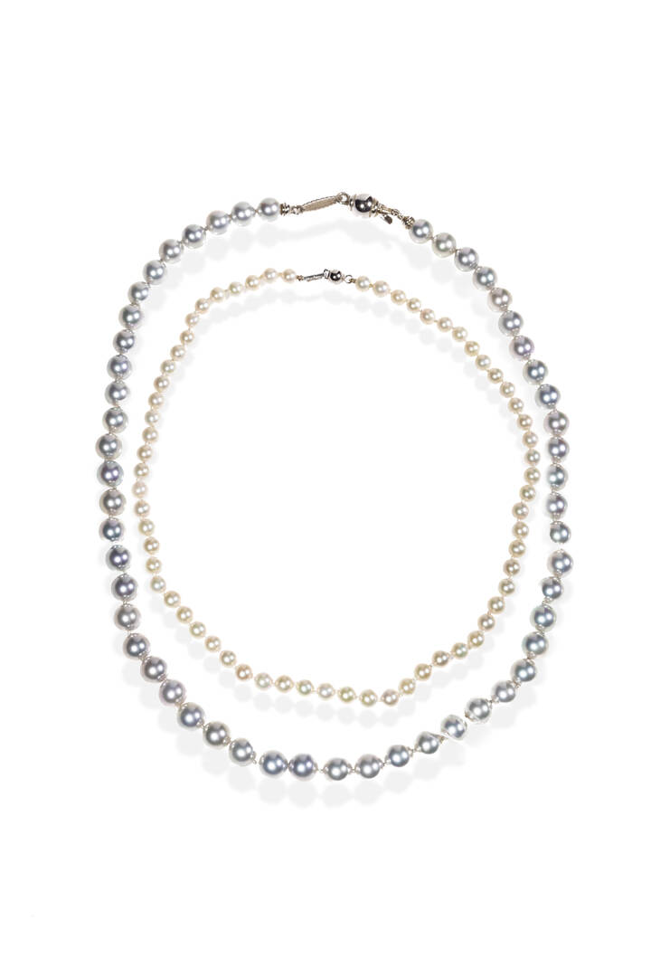 composte da perle di acqua dolce una di colore bianco e una di colore grigio. Chiusure in argento.