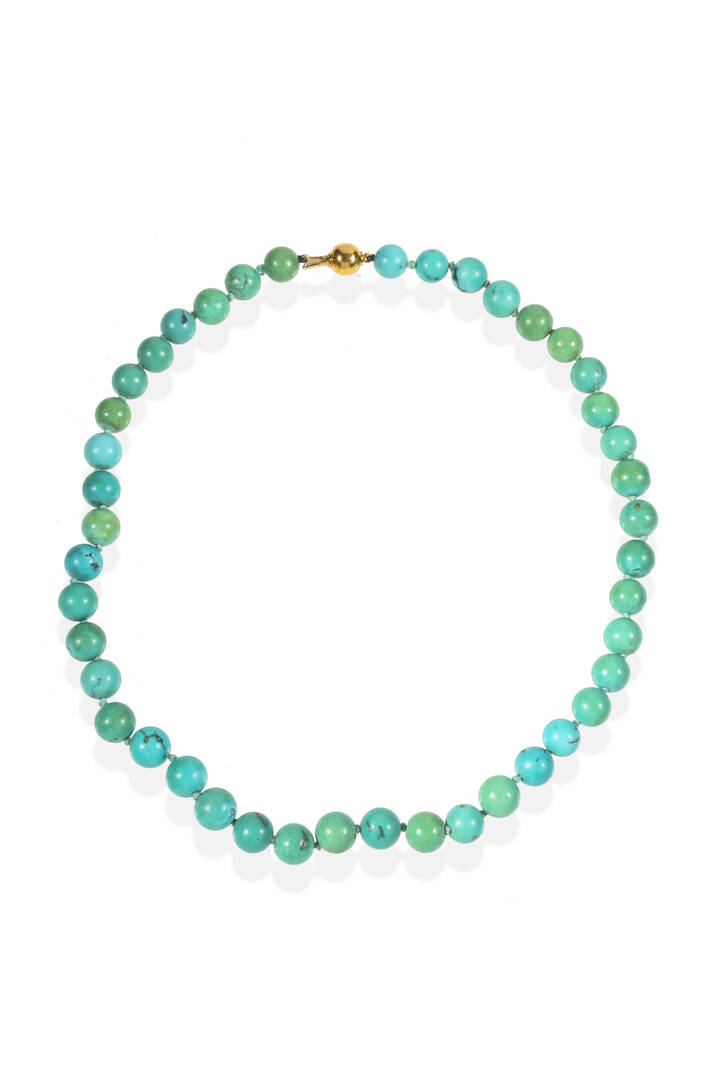 composto da sfere di turchese (viraggio cromatico) del diam. di mm 9. Chiusura in oro giallo a sfera
