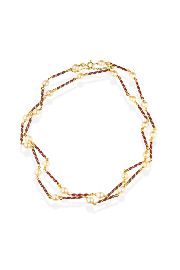 in oro giallo con segmenti torchon in smalto bordeaux, alternati a perle giapponesi del diam. di mm 6,2-6,4 (difetti).