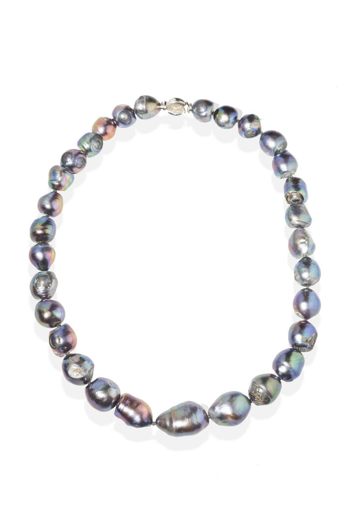 composto da perle Tahiti scaramazze nei toni del grigio scuro. Chiusura in oro bianco lucido e satinato.