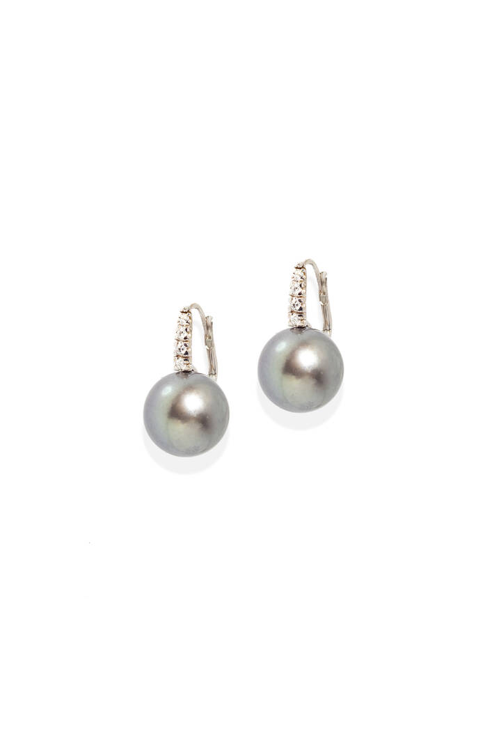in oro bianco, a monachella, con due perle Tahiti nei toni del grigio chiaro del diam. di mm 13,3 e 12,8; diamanti taglio brillante per totali ct 0,15 ca, probabile colore G-H, purezza IF-VVS