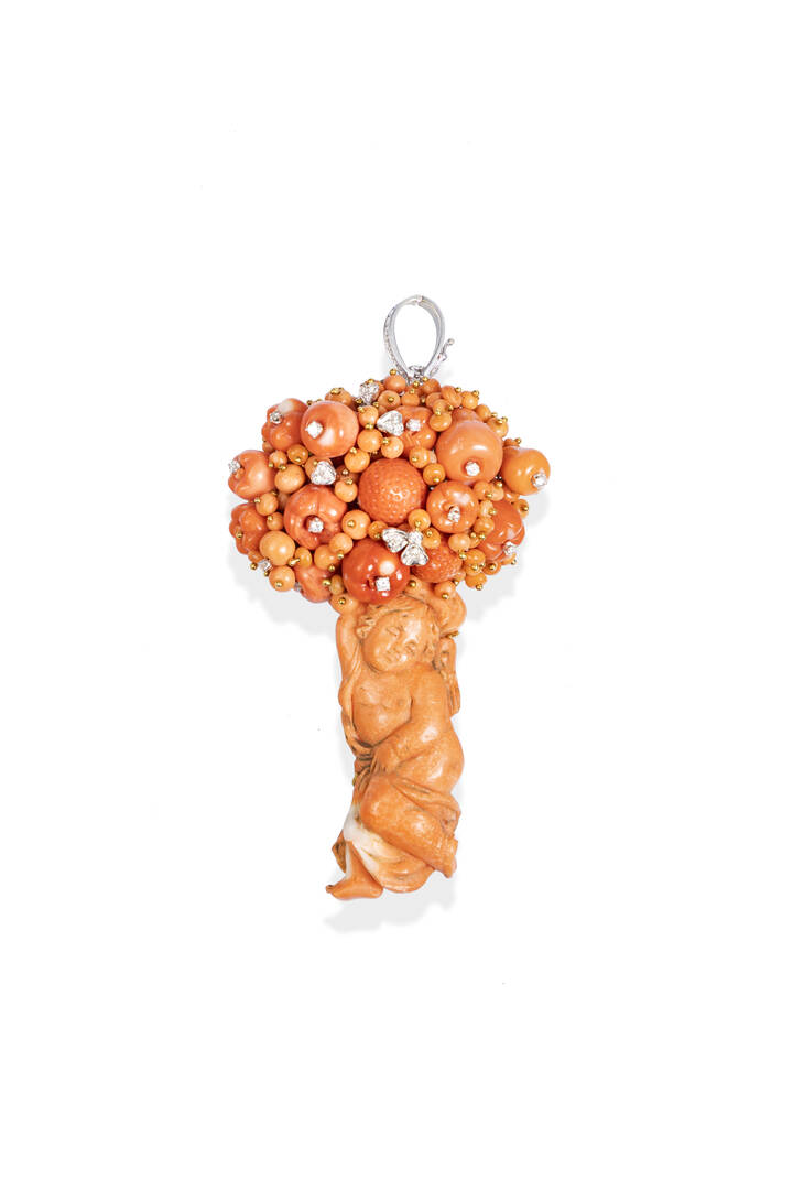 Splendida spilla-ciondolo, firmata "Andrea Ghelli", in oro giallo e bianco; composta da un putto in corallo mediterraneo nei toni del rosa; reggente sopra il capo grande cespuglio di sfere lisce e frutti e vegetali in corallo color salmone, di varie forme e misure.