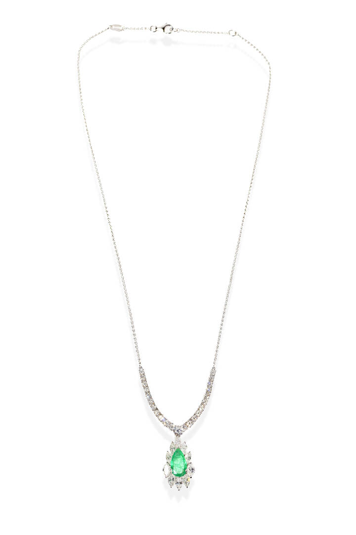 in oro bianco con smeraldo taglio a goccia di ct 1,50 ca, contornato da diamanti taglio navette e brillante per totali ct 2,50 ca, probabile colore G-H, purezza IF-VVS