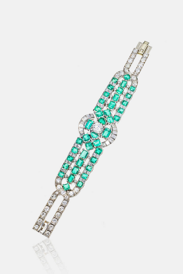 in platino, anni '30, con diamante centrale di ct 2,30 ca, probabile colore H, purezza SI1; smeraldi colombiani taglio ottagonale per totali ct 35 ca e diamanti a decoro taglio brillante, carré e stibs per totali ct 15,0 ca, probabile colore G-H, purezza VS-SI Marcato "456 B".