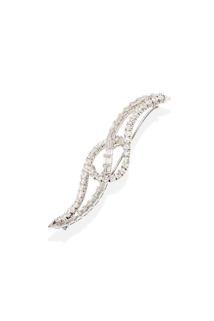 in platino, a voluta, anni '50, con diamanti taglio brillante e baguette per totali ct 5,0 ca, probabile colore G-H, purezza VS-SI