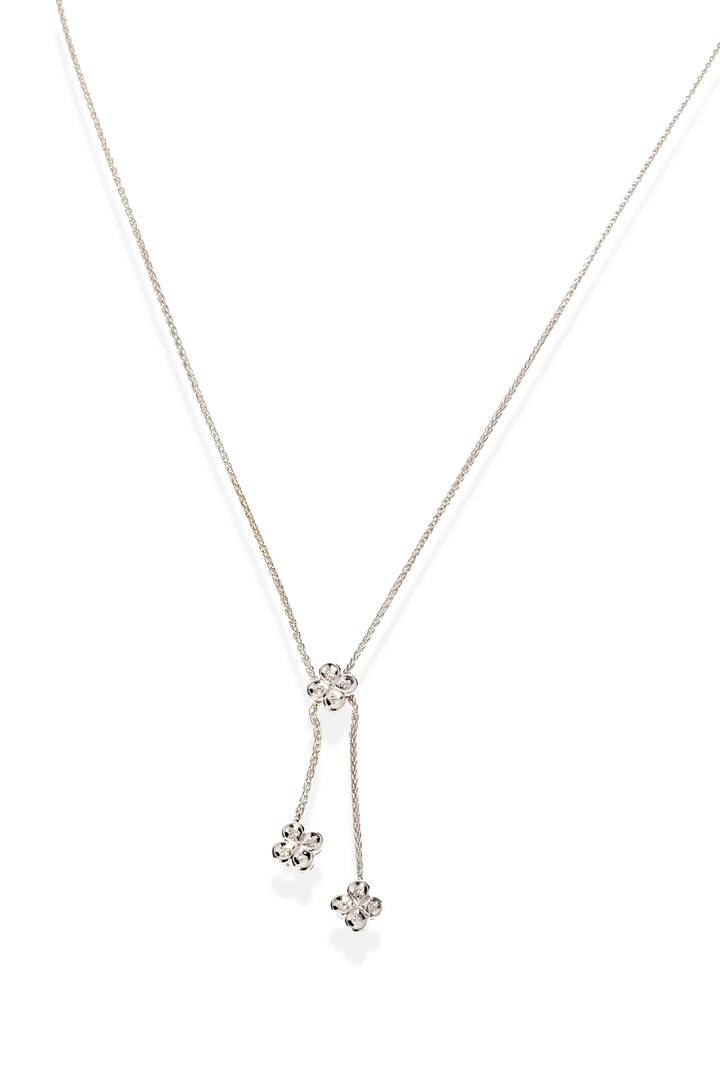 Girocollo in oro bianco, firmato "Damiani, con tre fiori pendenti con diamanti taglio brillante per totali ct 0,15 ca