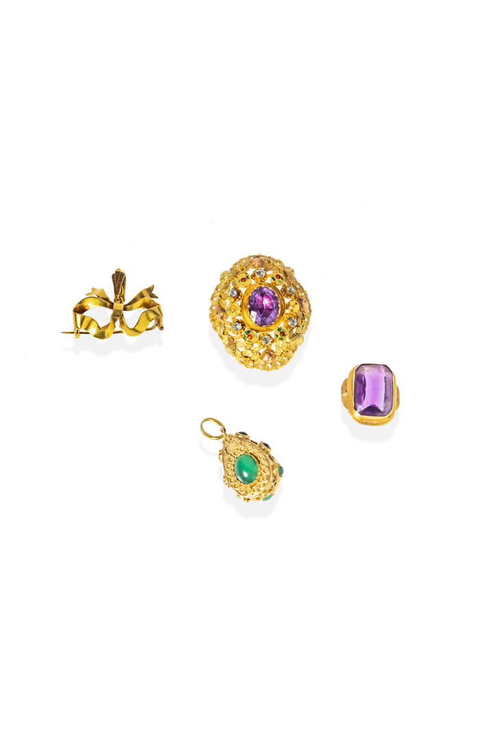 -spilla in oro giallo e rosa lucido e satinato, XIX secolo, con ghirlada di fogli e frutti; al centro ametista, smalti policromi, gemme sintetiche a decoro. Peso gr 10,6