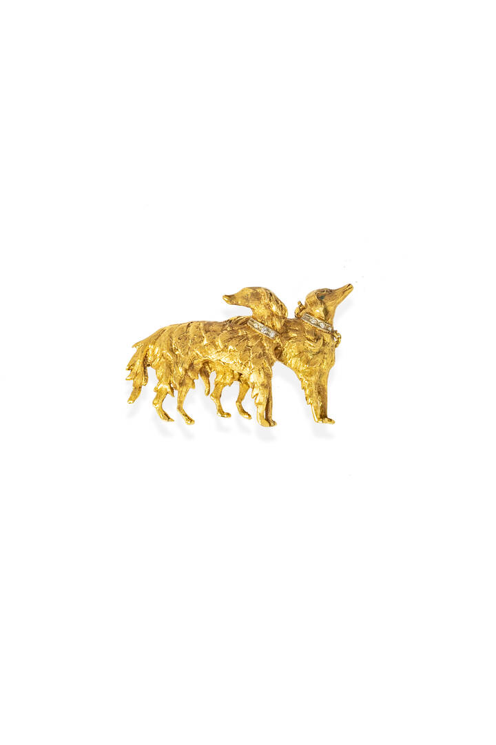 in oro giallo e bianco, composta da di due levrieri. Diamanti taglio 8/8 a decoro.