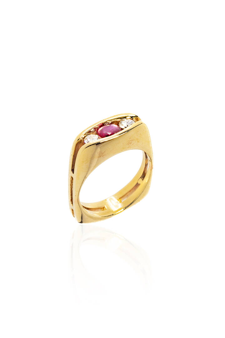 -in oro giallo, sommità quadrata, con rubino taglio ovale di ct 0,40 ca e due diamanti taglio brillante per totali ct 0,35 ca. Peso gr 3,5. Misura 14 (54)