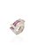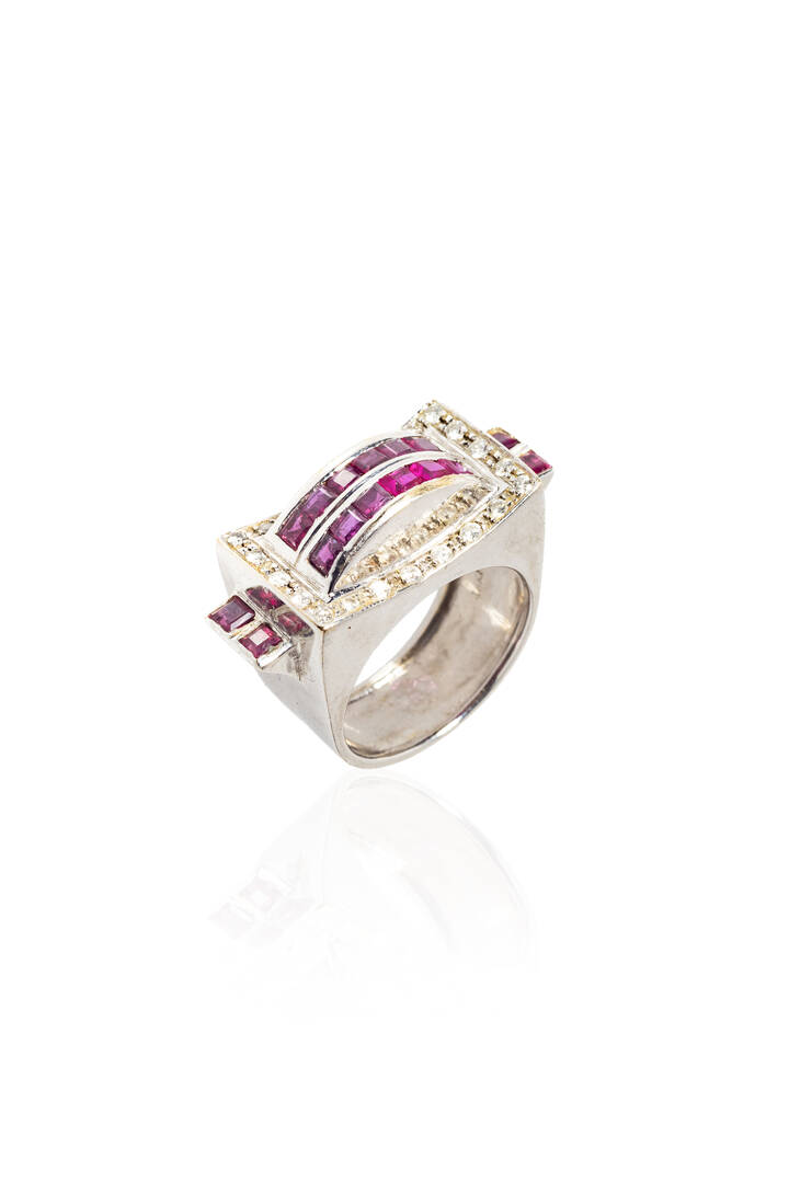in oro bianco, sommità a ponte, con diamanti taglio brillante per totali ct 0,40 ca e rubini taglio carré per totali ct 1,20 ca