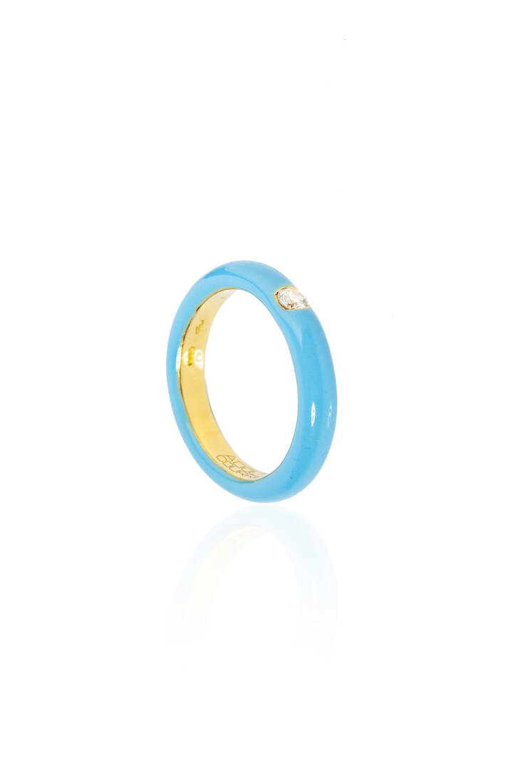 Lotto di quattro anelli in oro giallo e rosa, frimati "Courrier", due con smalto marrone e azzurro con al centr due dimanti taglio brillante per totali ct 0,20 ca; uno con pavé di granati e un diamante taglio brillante di ct 0,10 ca; uno com cinque granati taglio rotondo