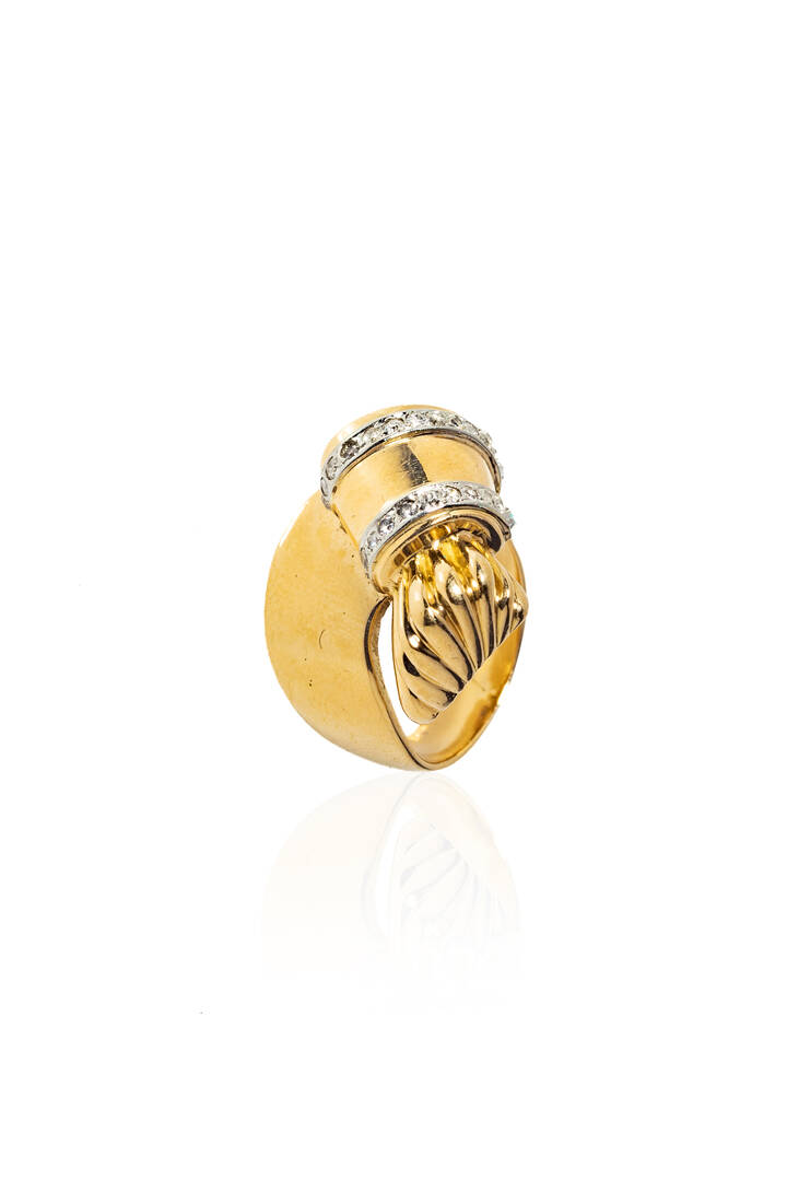 in oro giallo, sommità a nodo, con diamanti taglio 8/8 e tre zirconi.