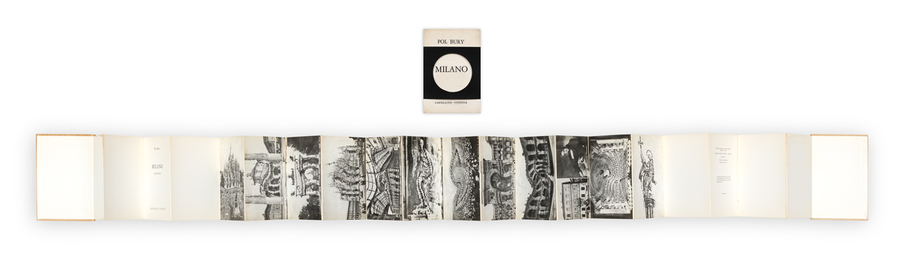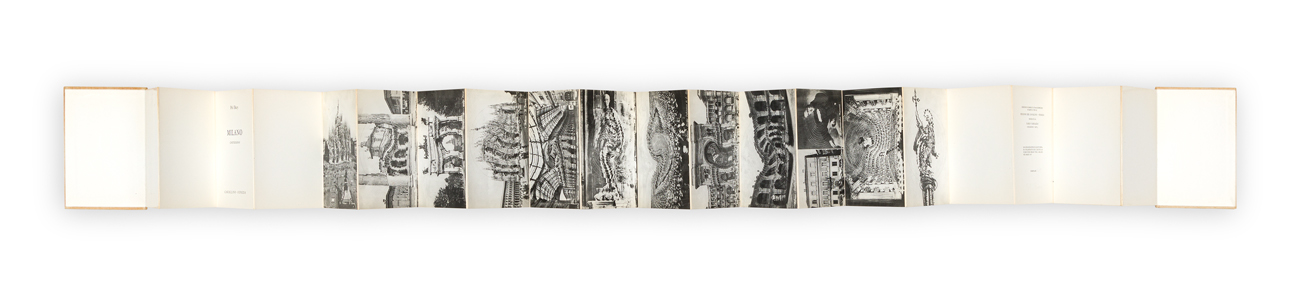 Libro d'arte a fisarmonica composto da 15 pagine riccamente illustrate con fotografie b/n elaborate di scorci di Milano