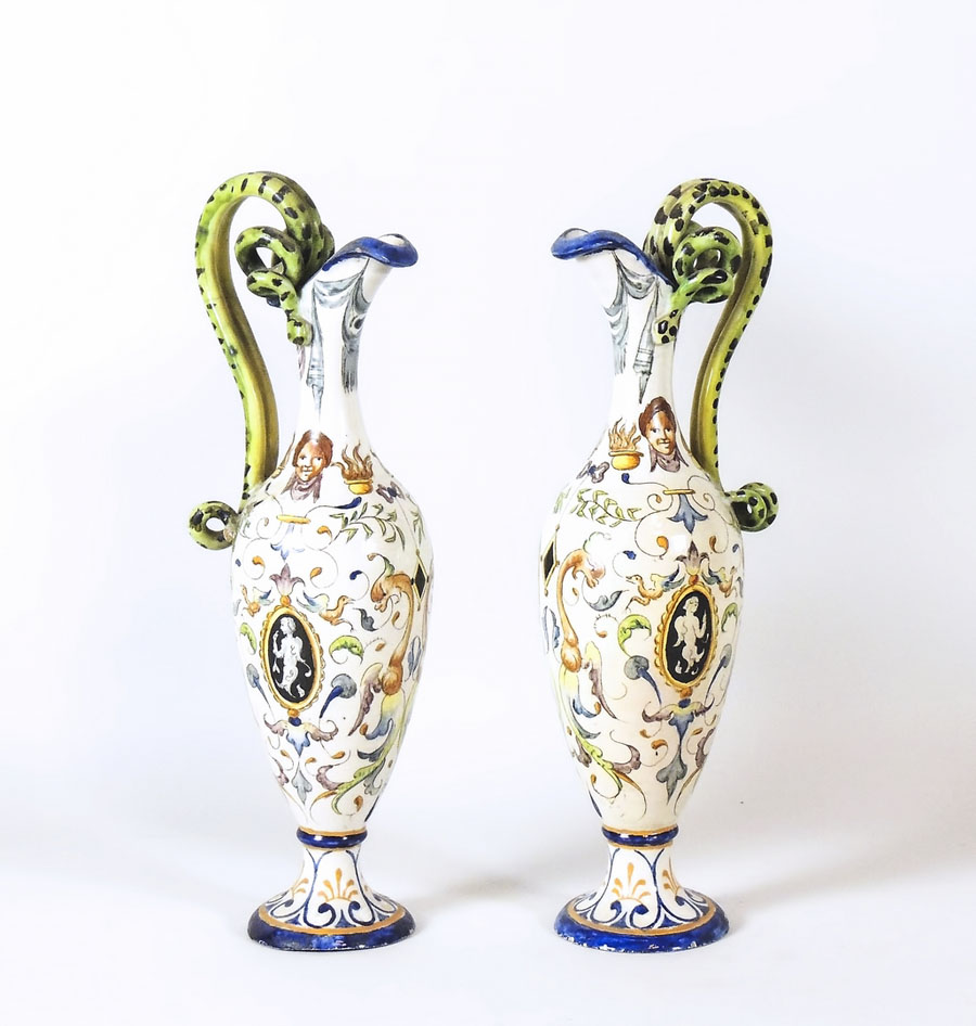 DUE PICCOLE ANFORE IN TERRACOTTA SMALTATA Molaroni, inizio del XX secolo dipinte con grottesche, anse a foggia di serpenti intrecciati, difetti h cm 32,5 TWO SMALL GLAZED TERRACOTTA AMPHORAS, MOLARONI, EARLY 20TH CENTURY