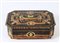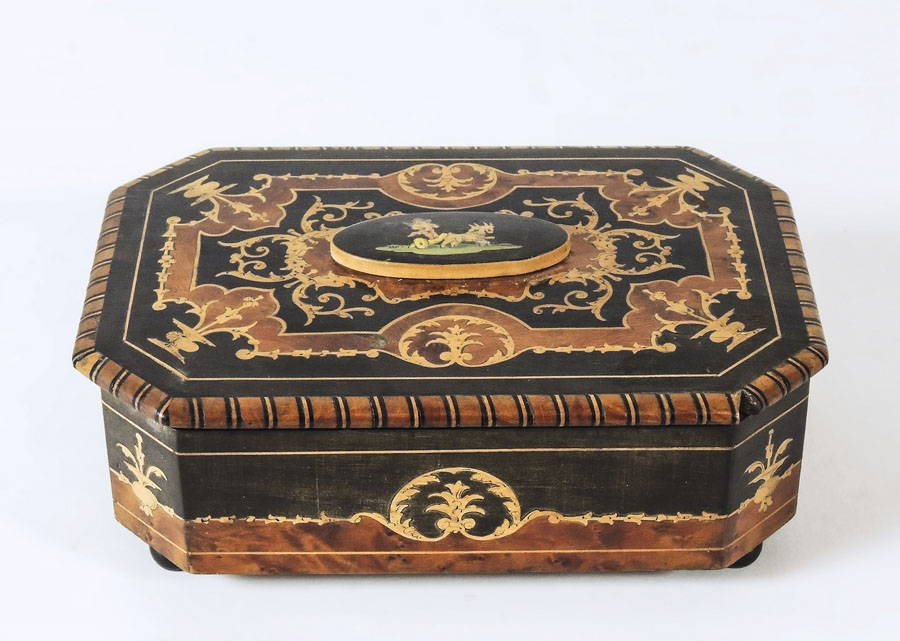 COFANETTO IMPIALLACCIATO IN RADICA DI NOCE E ALTRI LEGNI Manifattura Sorrentina coperchio intarsiato con volute, girali e puttino su biga trainata da due capre, piccola mancanza BURR WALNUT VENEERED AND OTHER WOODS BOX