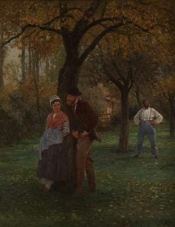 RUDAUX HENRY EDMOND Parigi 1865-1927 Il corteggiamento Olio su tavola 57x45 cm Firma in basso a destra Ottimo stato di conservazione, con cornice dorata e coeva al dipinto Oil on board Signed lower right