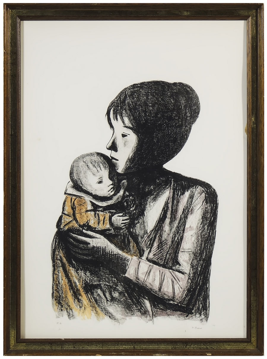 XAVIER BUENO (1915-1979) Maternità litografia, prova d'artista, firmata, in cornice cm 70x50 Reca timbro a secco Opera artigianale Atelier Xavier Bueno MATERNITY, LITHOGRAPH, WITH BLIND STAMP