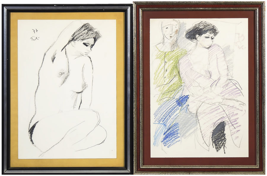 BRUNO PAOLI (1915-2005) Nudo e Figure 1977-79 due tecniche miste su carta, firmate e datate, in cornice cm 50x34,5 NUDE AND FIGURES, TWO MIXED MEDIA PANTINGS ON PAPER