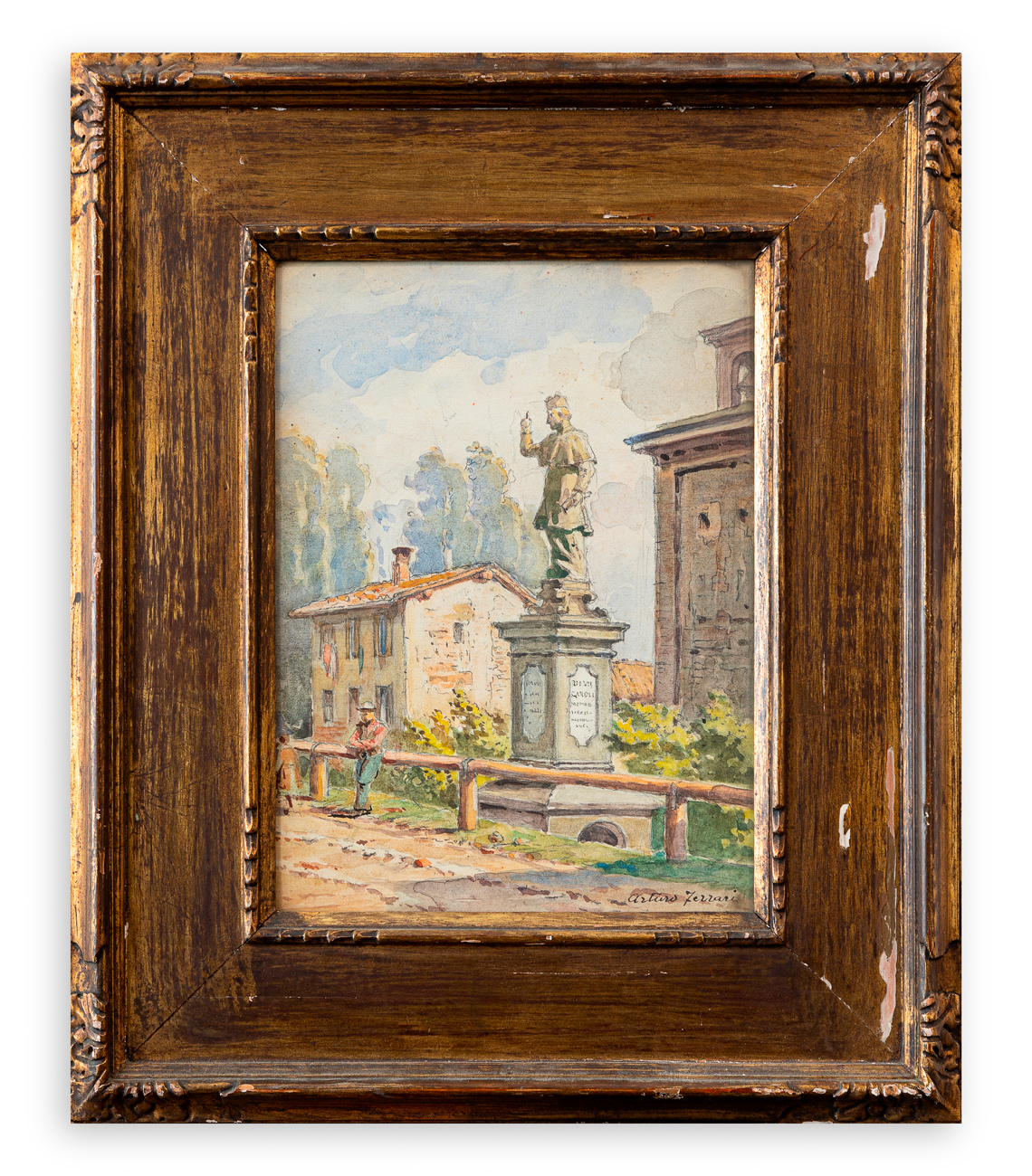 Cartiglio recante firma e iscrizione dell'Artista 'Statua di S. Carlo al Gentilino colla Roggia. Scena del 1890. Vecchia Milano' al retro del cartoncino protettivo