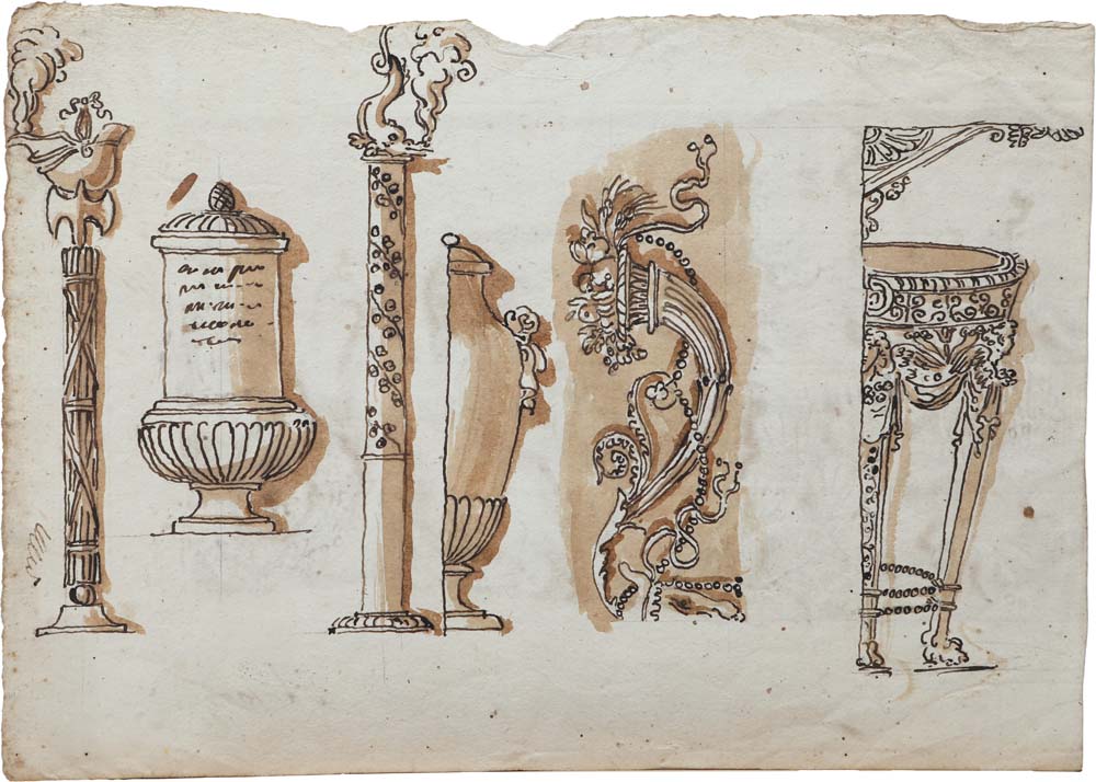 Recto: Studio di bassorilievo con grifone e girali - Verso: Studi di ornamenti architettonici China, pietra nera e inchiostro acquerellato su carta mm 181x260